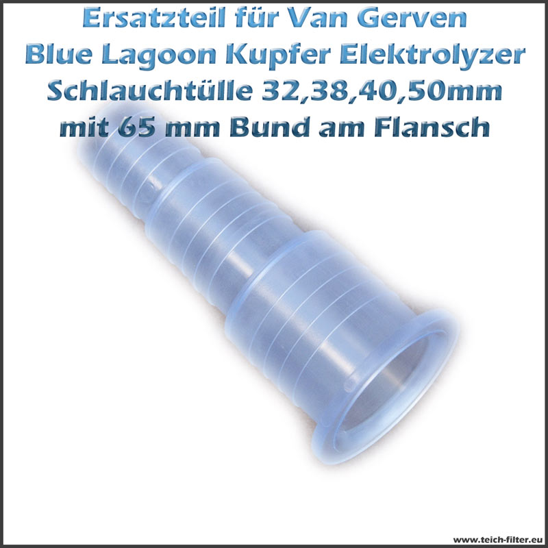 - Anwendungsbereich: diese transparente Schlauchtülle für 32, 38, 40 und 50 mm Schläuche passt durch den 65mm Bund ideal an den Ein- und Ausgang des Kupfer Elektrolyzers von Van Gerven (Blue Lagoon)