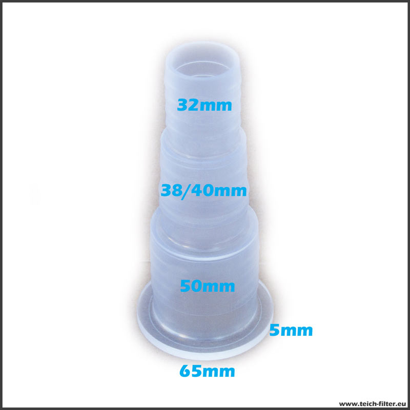 - Inhalt: 1 Schlauchtülle transparent mit 65 mm Bund (32, 38, 40 und 50 mm Schlauchanschluss)