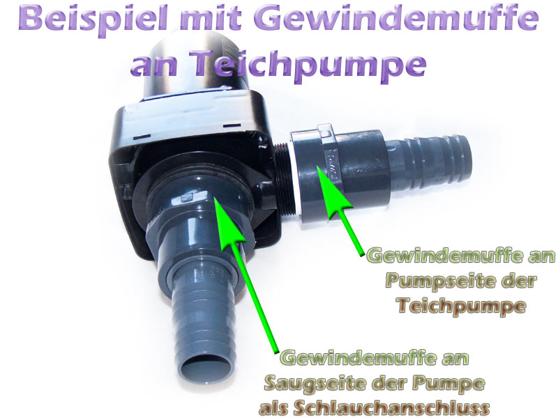 Sie sehen nun, welche vielen Möglichkeiten wir durch den Einsatz von Gewindemuffen am Teich haben. Nutzen auch Sie diese praktischen Möglichkeiten, wenn Sie Ihre Teichtechnik mit Schläuchen anschliessen wollen, aber keine fertigen Anschlüsse zur Verfügung stehen. Bauen Sie sich Ihre Anschlüsse mit Hilfe der Gewindemuffen schnell, günstig und unkompliziert selber. Hinzu kommt noch, dass die Bauweise der Gewindemuffen so stabil ist, dass diese vermutlich mehrere Teichpumpengenerationen überleben werden. Bei uns im Shop, können Sie die Gewindemuffen günstig kaufen.