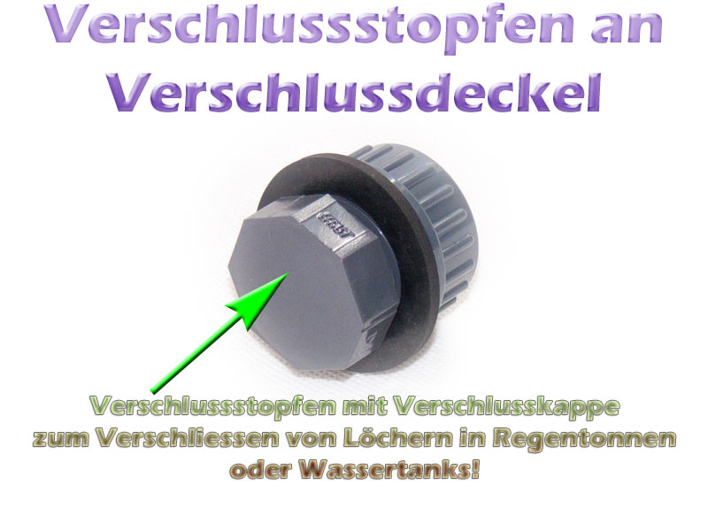 Mit dieser Konstruktion aus Verschlussstopfen, Verschlusskappe und Dichtung, können wir die Löcher an Regentonnen, IBC Containern oder allen anderen Wassertanks, ideal verschliessen. Sie müssen nur darauf achten, den richtigen Durchmesser des Gewindes zu verwenden. Also der Durchmesser des Zollgewindes, der dem Durchmesser der falsch gesetzten Bohrung in der Regentonne, am nächsten kommt.