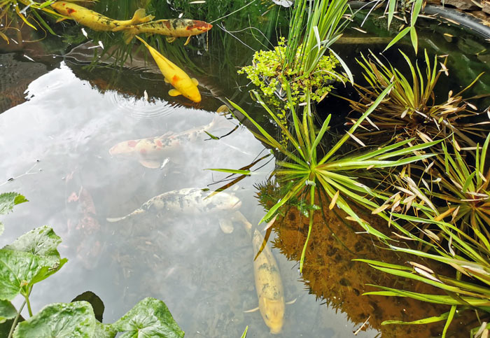 Man kann die Kois im klaren Teichwasser des GFK Beckens wunderbar sehen, bis auf den Teichgrund.